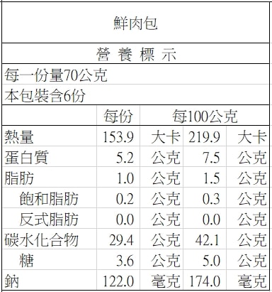 | 內容物(完整成份/食品添加物) | 麵粉 (小麥麵粉、維生素C)、水、豬肉(台灣/加拿大)、糖、洋蔥、青蔥、韭黃、白油 (精製棕櫚油)、酵母、無鋁泡打粉 (酸性焦磷酸鈉、碳酸氫鈉、玉米澱粉、磷酸二氫鈣)、香油 (大豆油、芝麻油)、薑、醬油、L-麩酸鈉、胡椒粉、香菇素蠔油、黃豆粉、黃酒、鹽、雞粉 (L-麩酸鈉、麵粉、鹽、酵母、葡萄糖、大豆蛋白粉、維生素C、木聚糖酶、α-澱粉酶、硫酸鈣、玉米澱粉、抗壞血酸、半纖維素酶、胺基乙酸、DL-胺基丙酸、I+G (5"-次黃嘌呤核苷磷酸二鈉、5"-鳥嘌呤核苷磷酸二鈉)、大麥、麥芽、焦糖色素、大豆水解蛋白粉、維生素B1)。 |