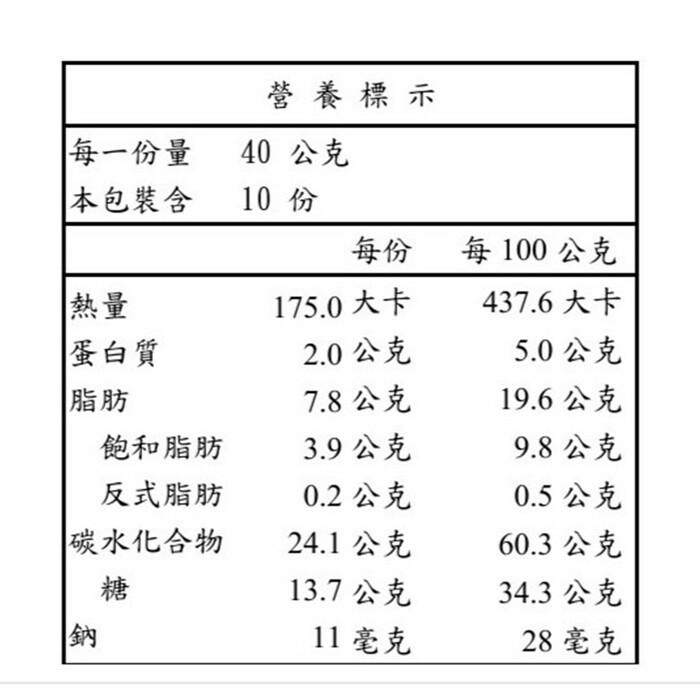 | 包裝內容/商品規格 | 10入/盒,共400公克 |