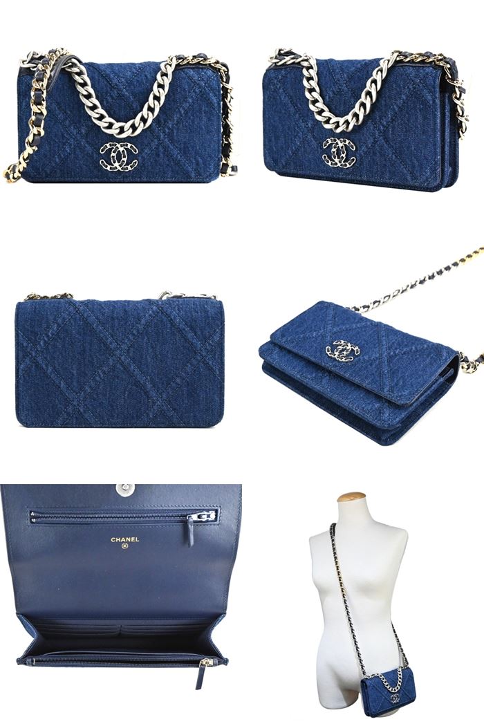 | 【商品名稱】 | 【CHANEL】19 經典LOGO菱格紋丹寧金銀漸層鏈帶WOC斜背包-藍色 [平輸] |
