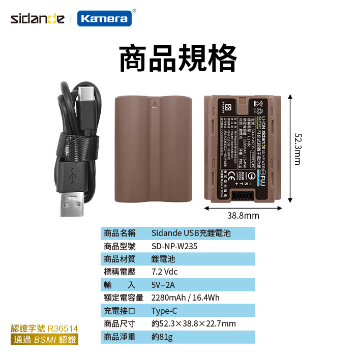【Sidande】SD-NP-W235 USB充電式鋰電池(TypeC供電) |
