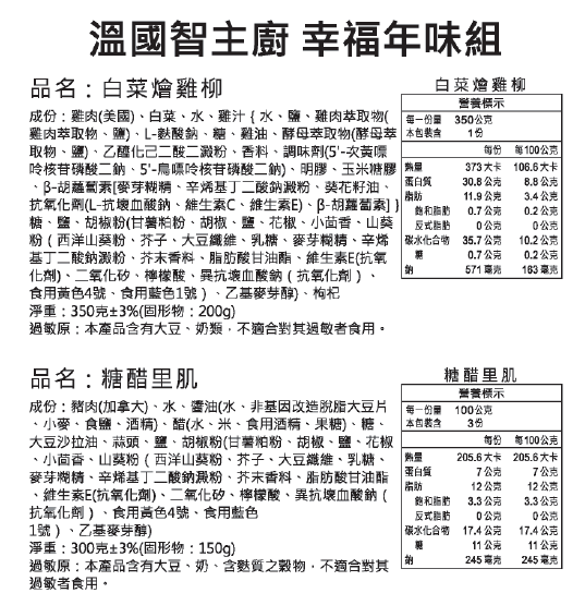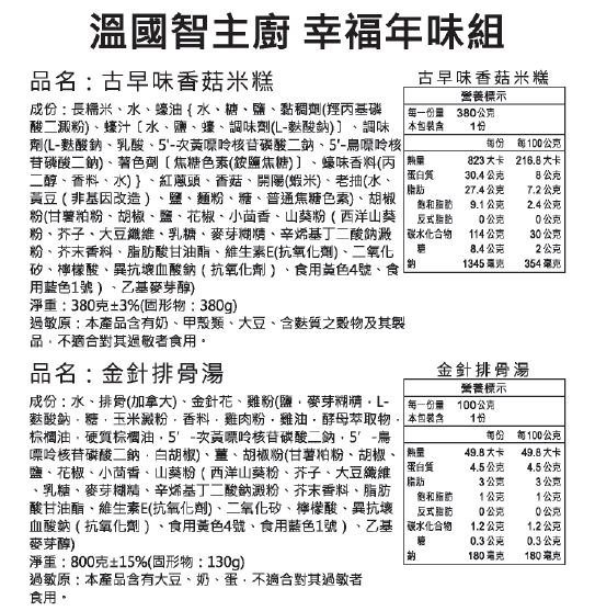- 規格:糖醋里肌300公克、白菜燴雞柳350公克、古早味香菇米糕380公克、金針排骨湯800公克