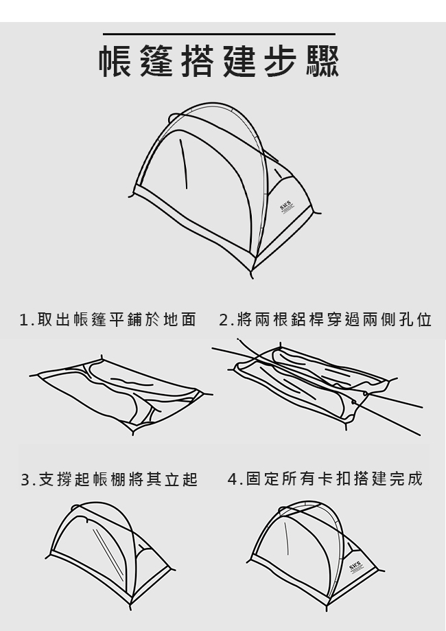 | 【內容物】 | 帳篷x1(單層.無內外帳之分)、鋁合金帳桿x2、地釘x8、橫桿x1、風繩x4、帳頂置物網x1、 收納袋x1 |