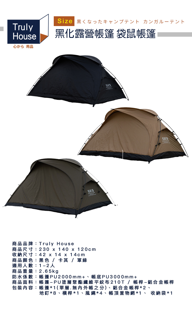 | 【商品名稱或型號】 | 【Truly House】軍風黑化露營帳篷 袋鼠帳篷 - 3色可選 |
