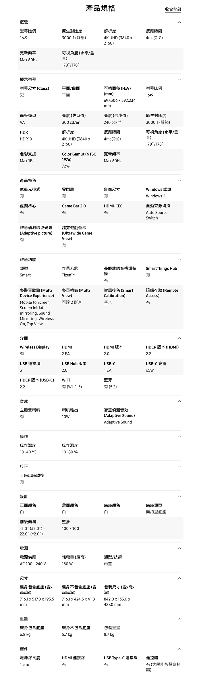 | 商品名稱 | Samsung 32型 4K M7 FollowMe AI智慧聯網移動式螢幕組-白(S32FM703UC+移動式立架) |