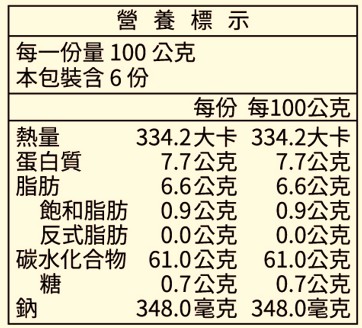 | 過敏原資訊 | 本產品含有大豆、含麩質之穀物及其製品,不適合對其過敏體質者食用。 |