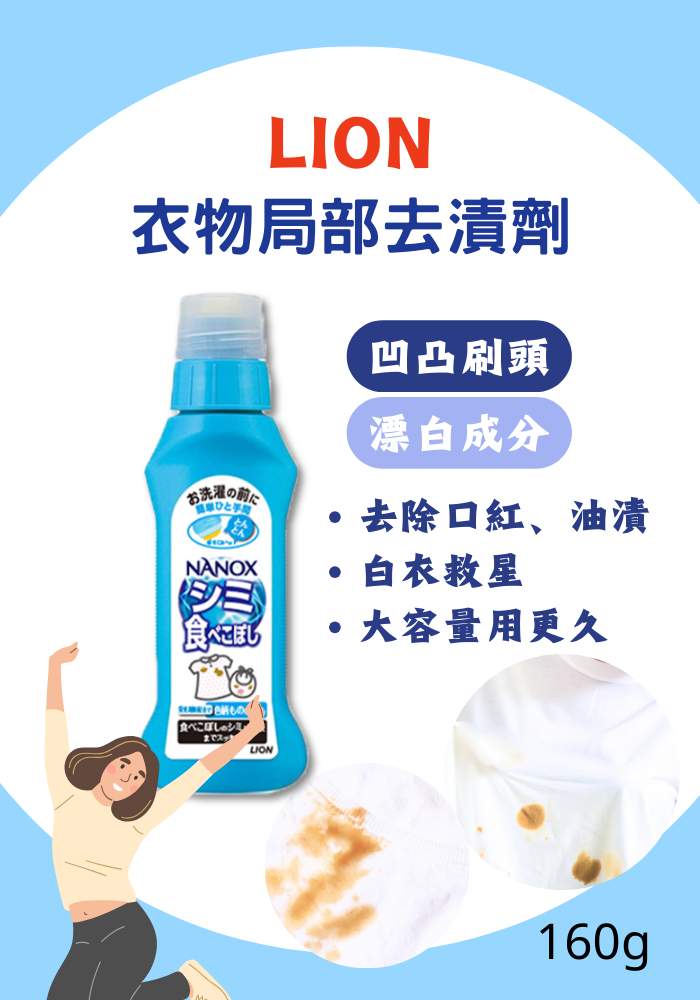 可水洗的白色衣物、有顏色、圖案的纖維製品(棉、麻、化學纖維、毛、絹)上的髒汙去漬用 |