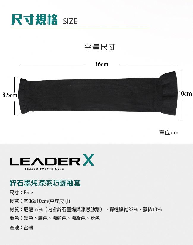 | 【商品名稱】 | 【Leader X】台灣製 鋅石墨烯涼感防曬袖套 [2雙超值組] |