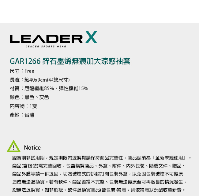 | 【商品名稱】 | 【Leader X】台灣製 鋅石墨烯無痕加大涼感袖套 [2雙超值組] |