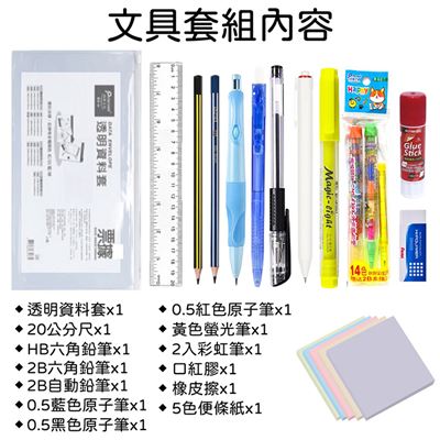 | 內容物 | (透明資料套x1+20公分尺x1+HB六角鉛筆x1+2B六角鉛筆x1+2B自動鉛筆x1+0.5藍色原子筆x1+0.5黑色原子筆x1+0.5紅色原子筆x1+黃色螢光筆x1+2入彩虹筆+口紅膠x1+橡皮擦x1+5色便條紙x1)x3套 |