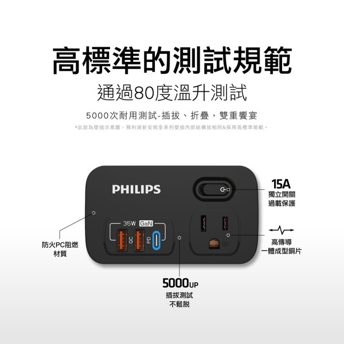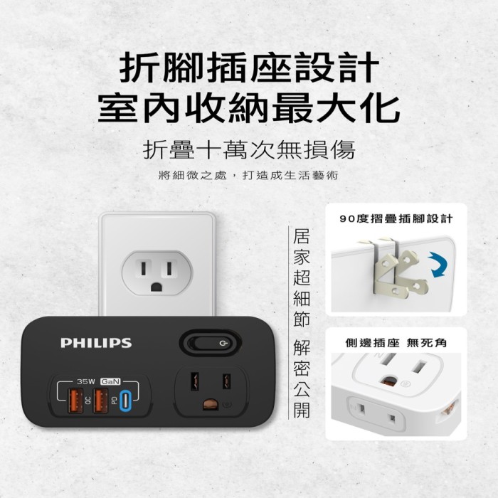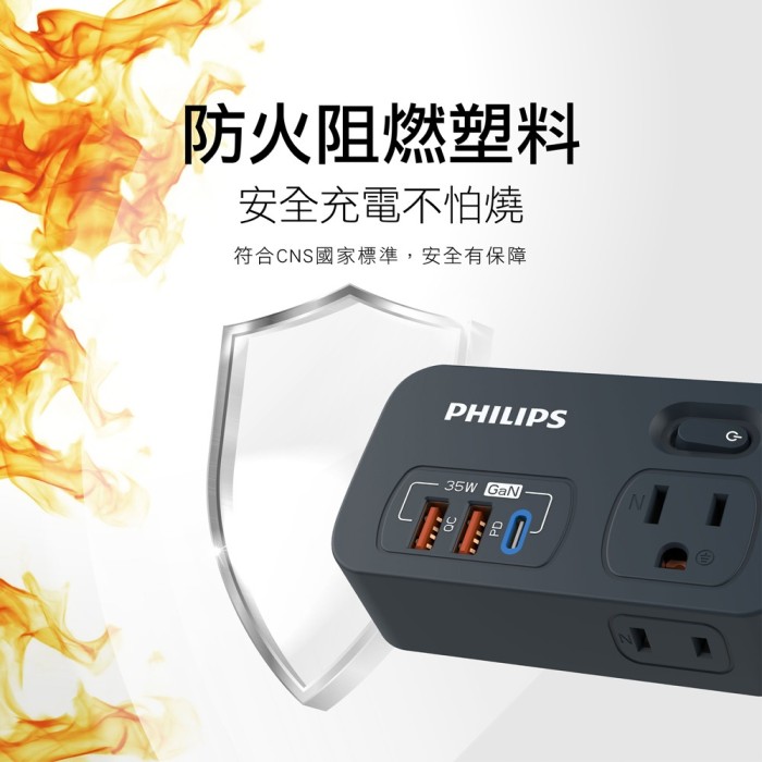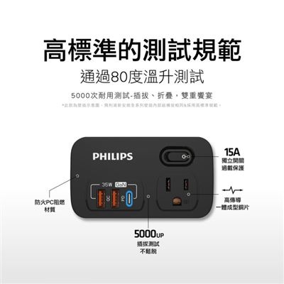 | 商品名稱 | 【PHILIPS飛利浦】 新安規 1開2壁插 3USB QC3.0+Type C PD 35W 黑色 |