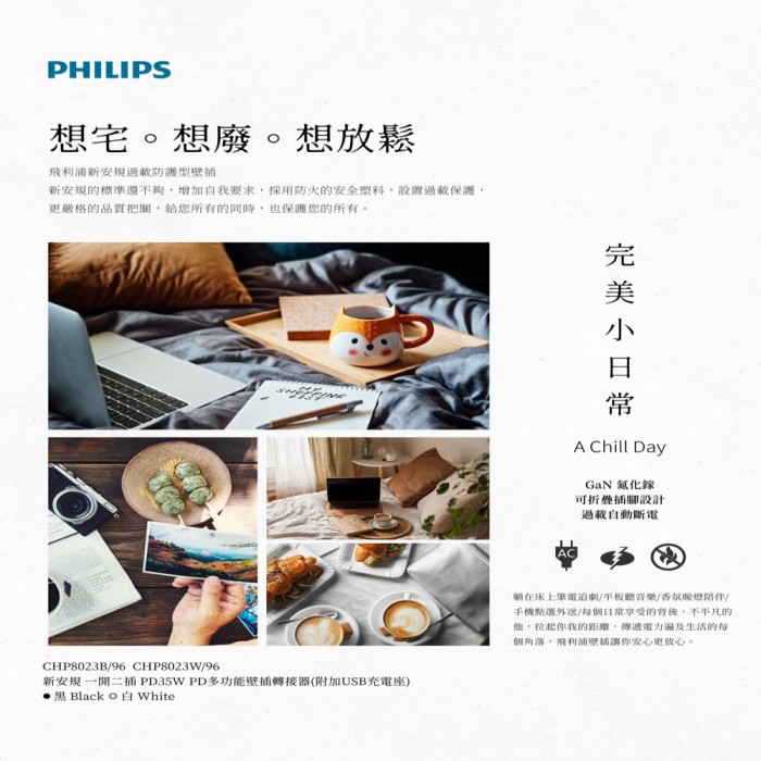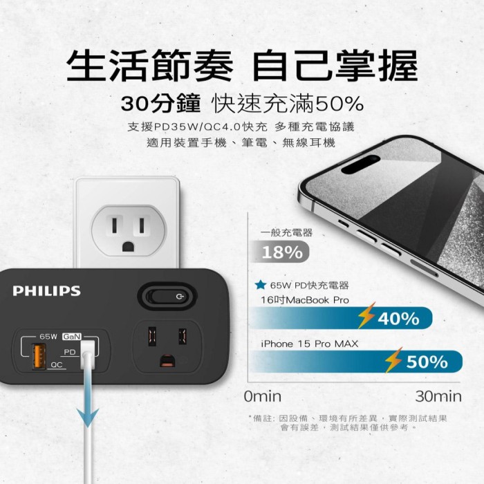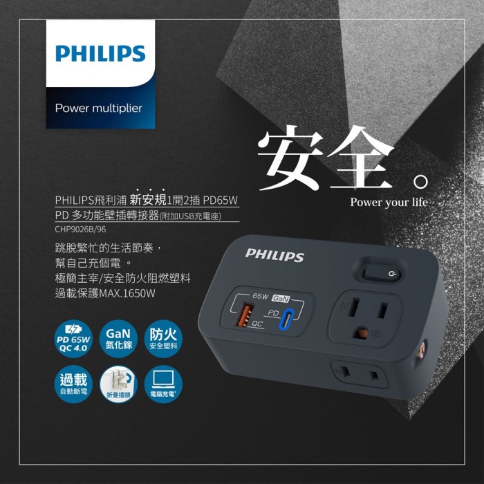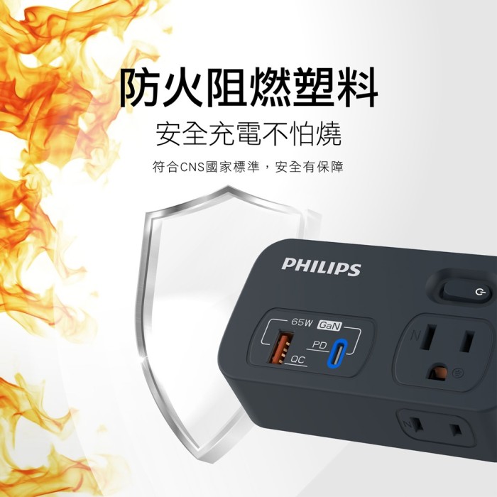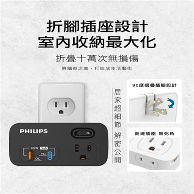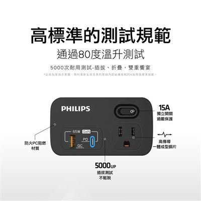 | 商品名稱 | 【PHILIPS飛利浦】 新安規 1開2壁插 3USB QC3.0+Type C PD 65W 黑色 |