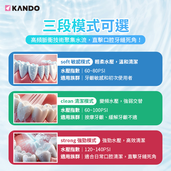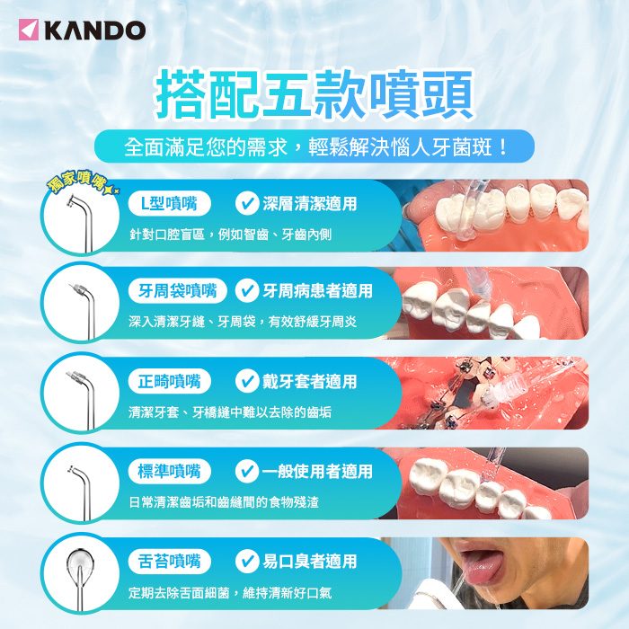 - 5種噴頭:標準噴嘴、正畸噴嘴、牙周袋噴嘴、舌苔噴嘴、L型噴嘴,滿足不同口腔族群清潔需求。