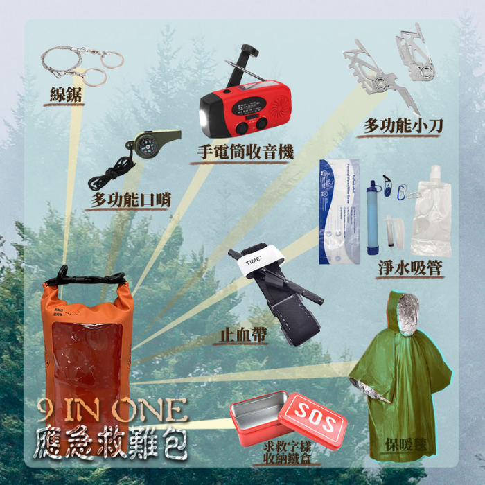 SOS應急盒x3 野外鋼線切割線x3 多合一求生哨x3 多功能手搖收音機x\3 多功能卡片x3 隔熱保暖雨衣(綠)x3 防護戰術止血帶x3 野外濾水器x3 單人防水袋x3 |