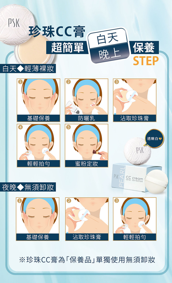| 商品成分 | 珍珠CC膏10g:微粒珍珠細粉、生物保護因子(ANTILEUKINE 6®)、蘆薈萃取、維生素E、乳木果油 純物理全能潤色隔離霜 /純物理全能輕透防曬乳:海藻抑油淨因子 Phlorogin®、肌膚防護因子RonaCare® AP、鎖水磁石Pentavitin® 、澳洲塔斯曼尼亞胡椒莓 Tazman Pepper™ AF |