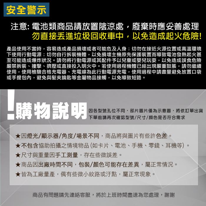 | 【保固說明】 | ⛔保固期限:一年(購買日開始)/消耗品無保固 ⛔保固範圍:行動電源(產品故障,非人為損壞)/充電線(新品瑕疵) 若產品需更換時,必須是完整包裝及配件 |