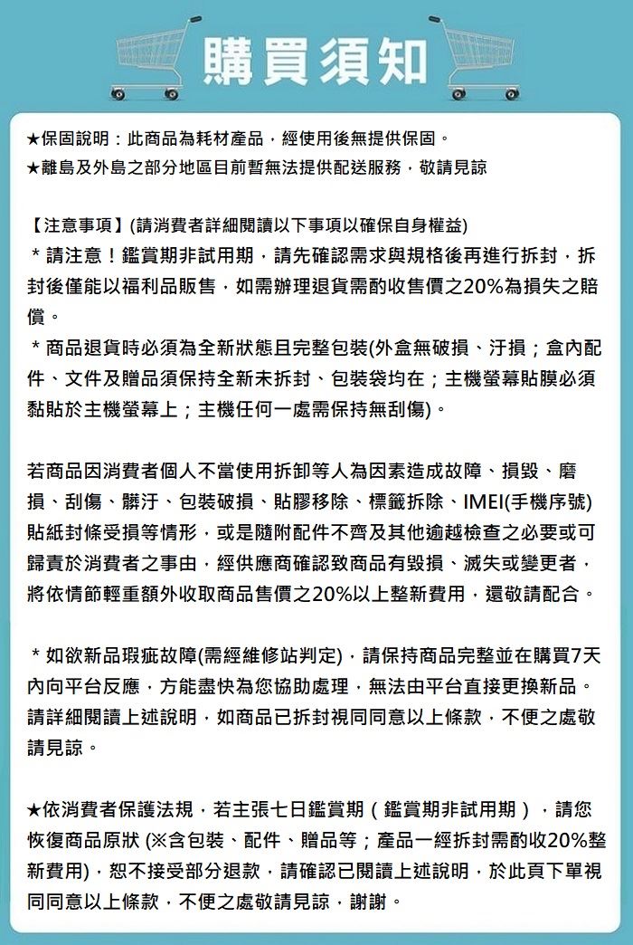 | 注意事項 | ★保固說明:僅接受七天新品瑕疵換貨 ★離島及外島之部分地區目前暫無法提供配送服務,敬請見諒 |