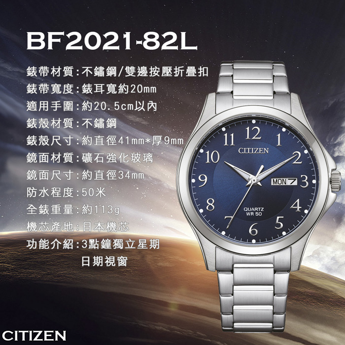 | 【商品名稱】 | 【CITIZEN 星辰】夜光指針50米防水男錶BF2021-82L [送項鍊][平輸] |
