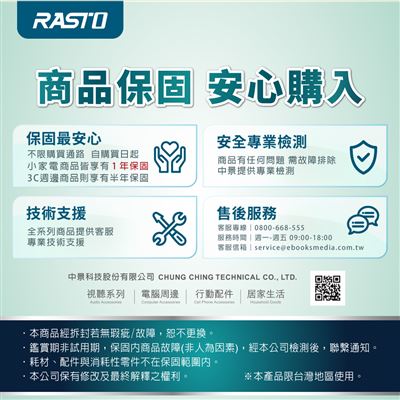 | 保固說明 | 非人為因素之損壞,原廠保固1年;商品如有使用問題,請與我司聯繫,請勿自行拆解,拆解後恕不保固 |