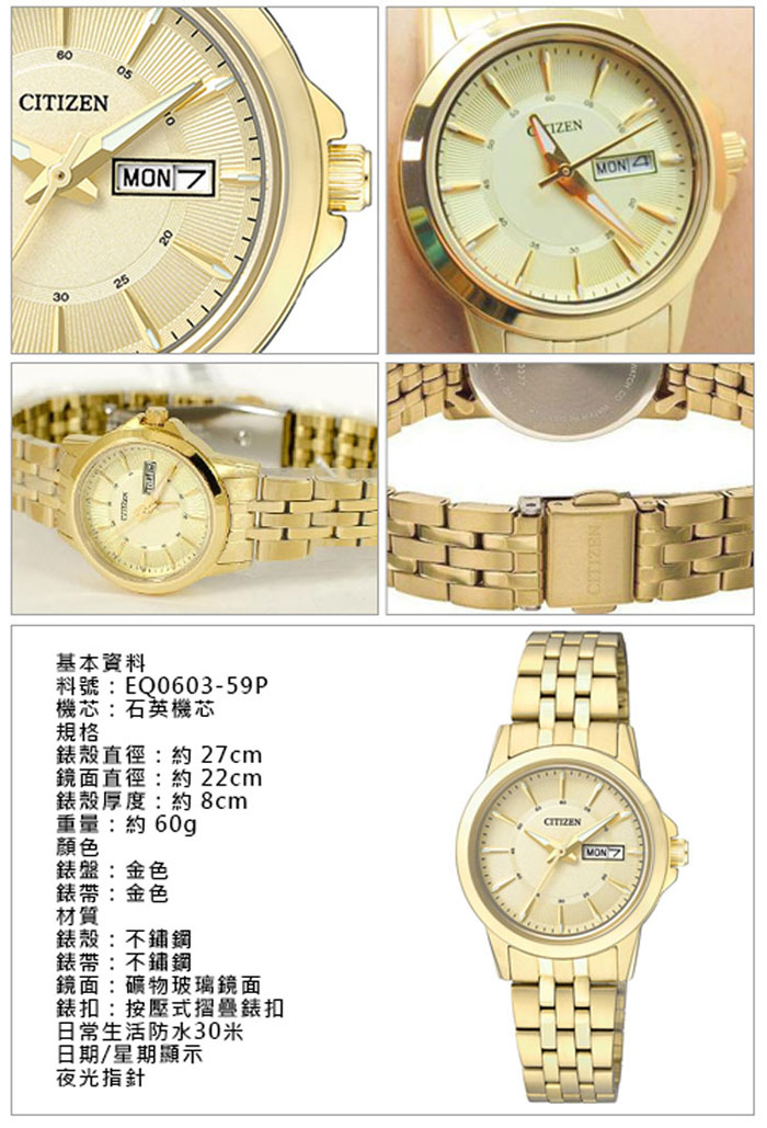 | 【商品名稱】 | 【CITIZEN 星辰】秀麗金系風格石英女錶EQ0603-59P [送項鍊][平輸] |