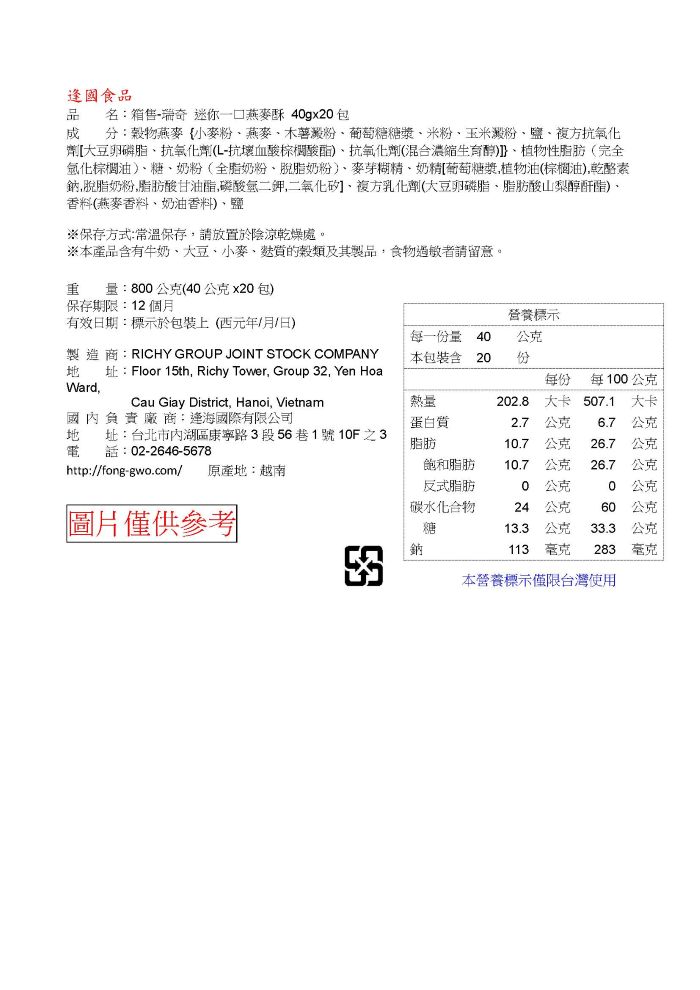 | 過敏原資訊 | ※本產品含有牛奶、大豆、小麥、麩質的穀類及其製品,食物過敏者請留意。 |