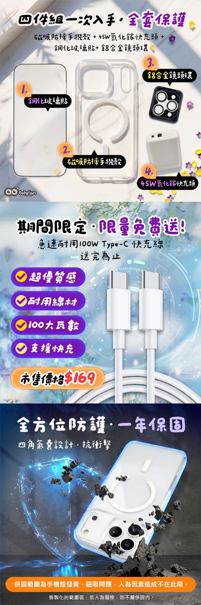 商品內容:空壓殼x1/鋼化保護貼x1/鏡頭貼x1/T45充電器45W(1A1C)x1/(TypeC-C)充電線x1/清潔包x2