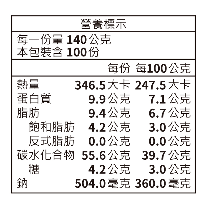 | 過敏原資訊 | 本產品含有大豆、麩質之穀物及其製品,不適合對其過敏體質者食用 |