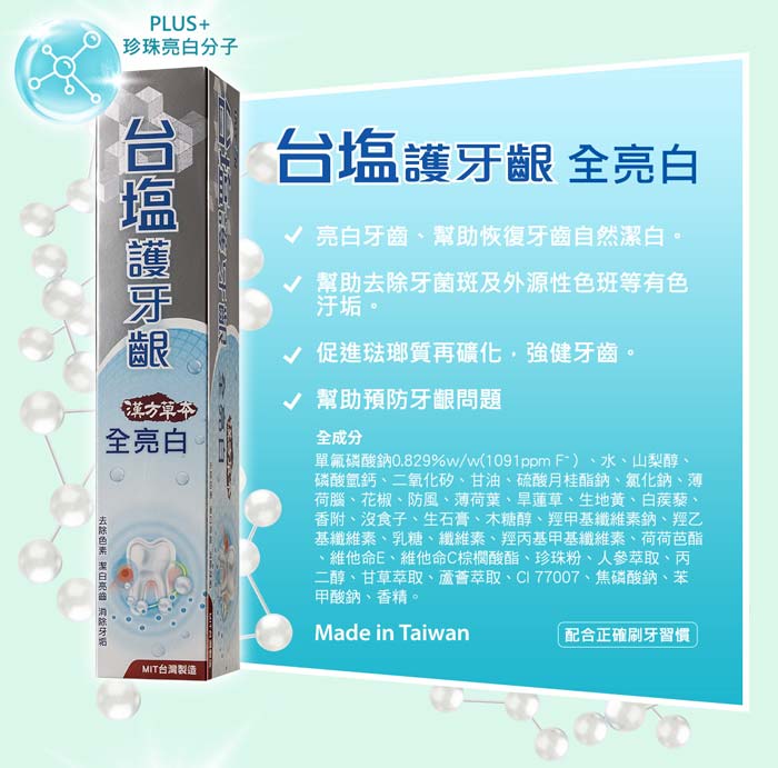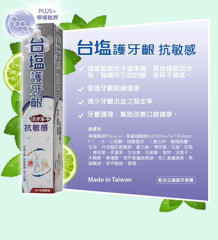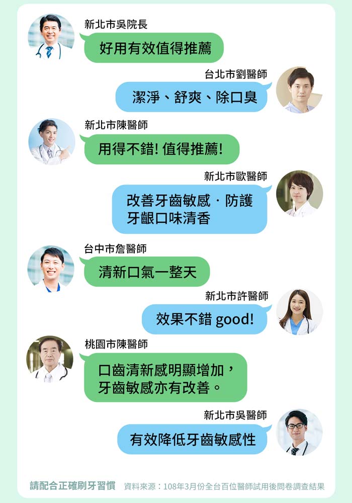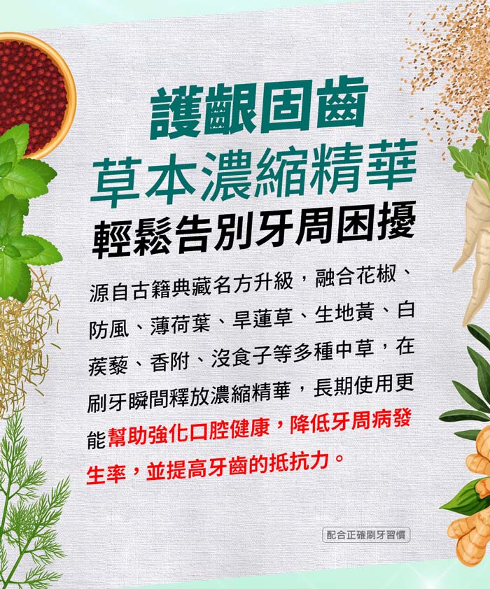 | 注意事項 | (1) 不可大量吞食,使用後漱口吐出,使用後如有不適,請暫停使用 (2) 六歲以下兒童用量宜酌減為1粒豌豆大小,使用前請諮詢牙醫或醫師。 (3) 本產品含有中草精萃研磨粒子,無添加人工色素,色澤如有些微不均或些微差異屬自然現象,請安心使用 (4) 建議使用以四週為宜,若敏感問題無改善或有其他口腔問題,請儘速諮詢牙醫。 |