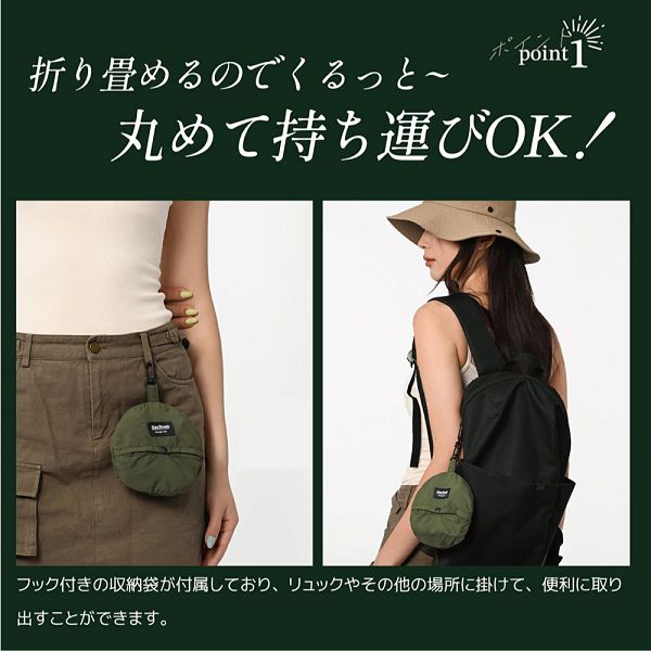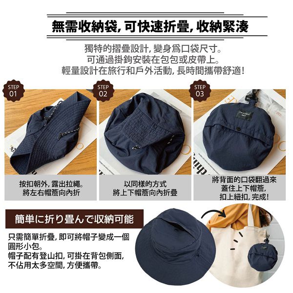 不需額外帽袋,輕鬆幾步驟折疊成圓形,附掛鉤可直接掛在包包外側,隨手拿取超便利。