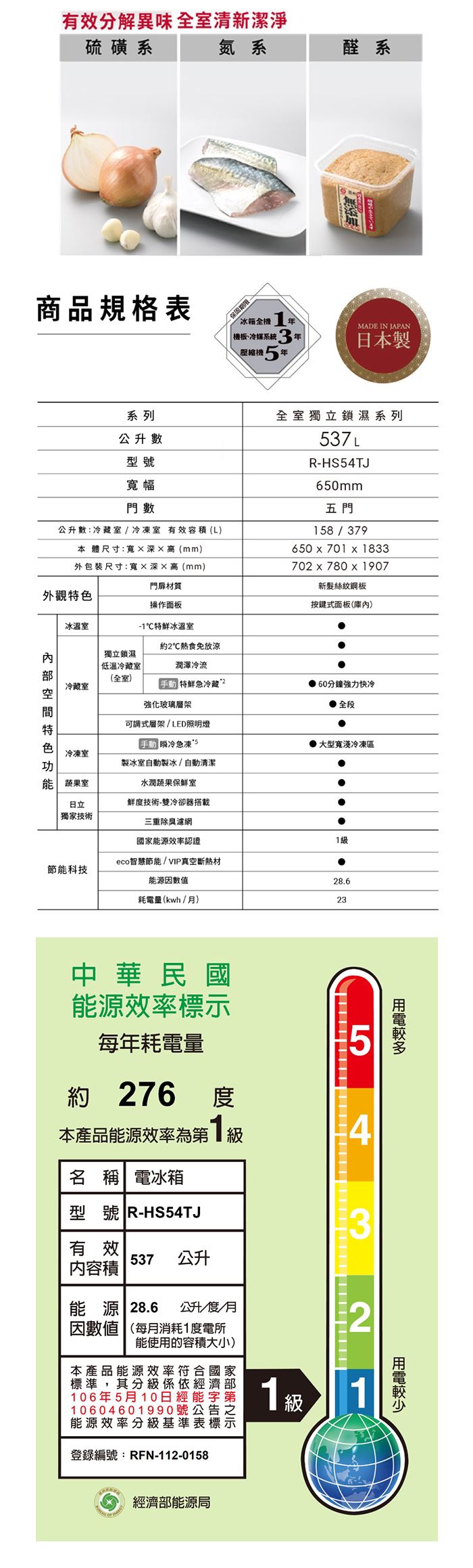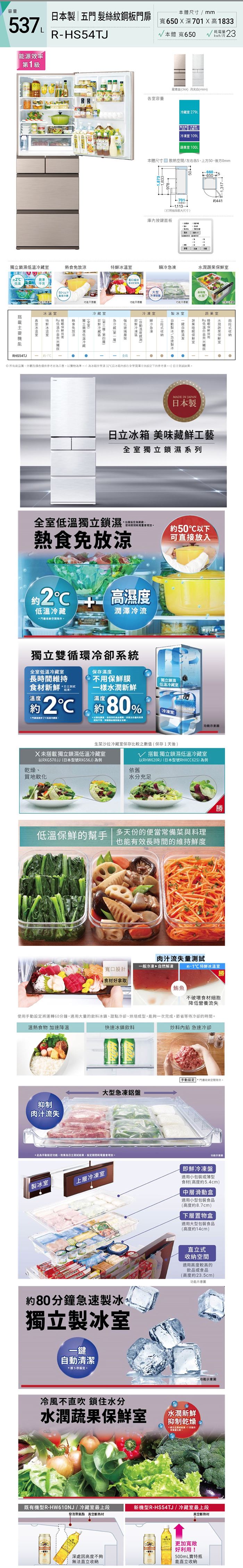 | 商品名稱 | 【HITACHI 日立】537L 一級能效 日製變頻五門冰箱 |