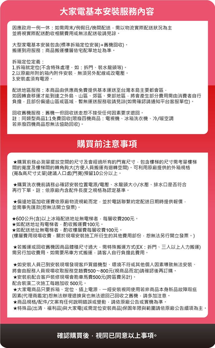 | 保固說明 | 全機一年、壓縮機五年(保固年限依原廠公佈或保證書為主) |