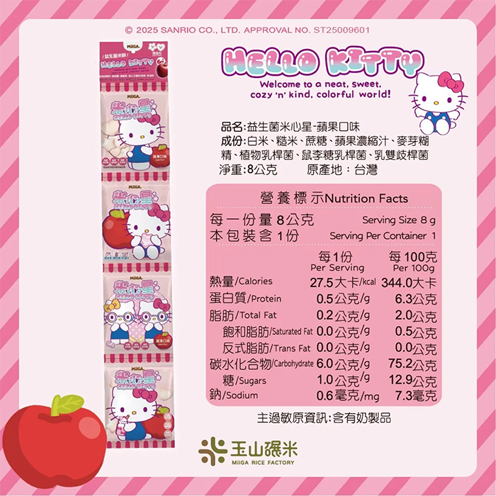 | 內容物(完整成份/食品添加物) | 白米、糙米、蔗糖、蘋果濃縮汁、麥芽糊精、植物乳桿菌、鼠李糖乳桿菌、乳雙歧桿菌 |