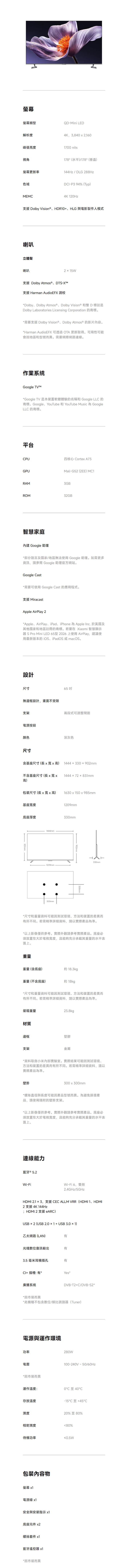 | 商品名稱 | Xiaomi 智慧顯示器 S Pro Mini LED 2026 65型 |