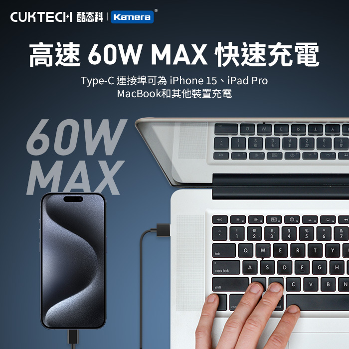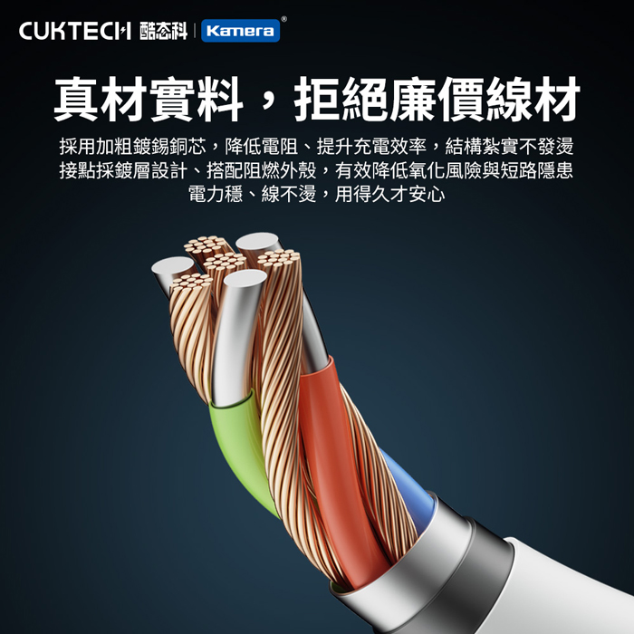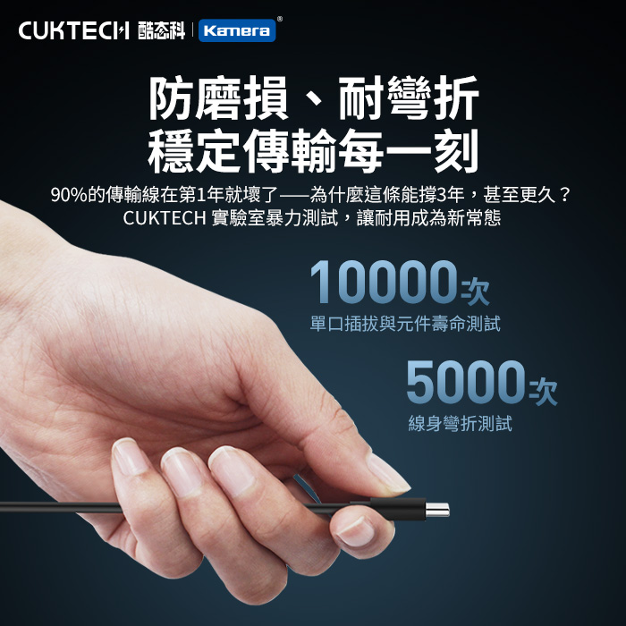 - 耐彎耐磨,線材就是不怕操。根據經驗,90%的傳輸線1年內會出問題,但CUKTECH不一樣!採用耐用的TPE材質,經過5,000次彎折與10,000次插拔測試,耐磨抗拉不易斷,比一般市售傳輸線更能撐、夠持久。