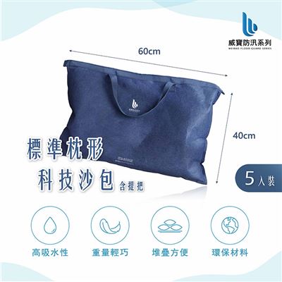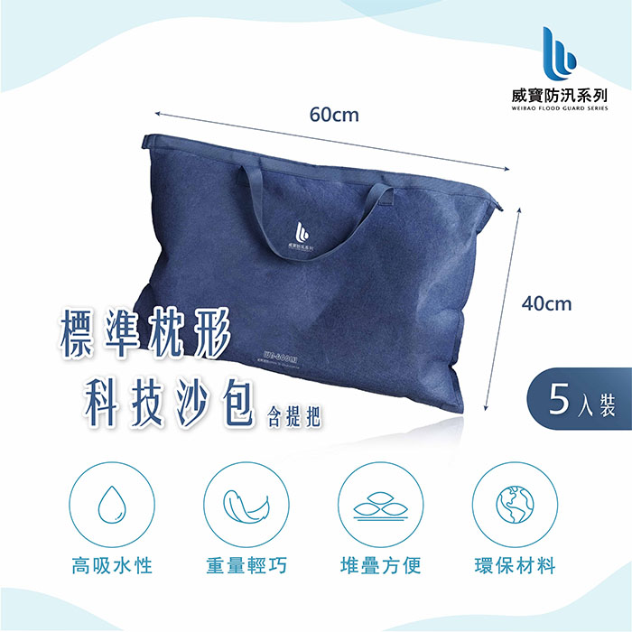 標準枕形科技沙包(含提把)同為經典外型,方便交叉堆疊來達到穩固的防洪效果。