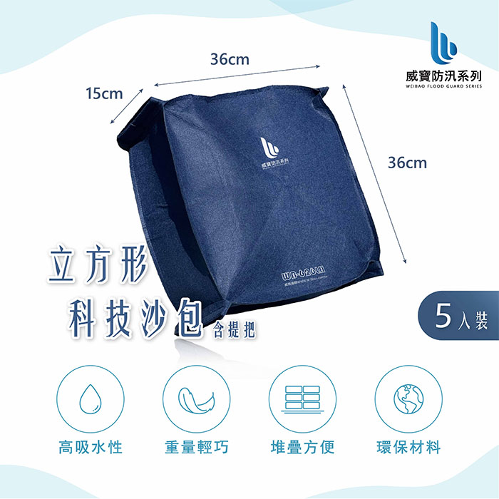 立方形科技沙包(含提把)結合了立體設計,適合垂直堆放,提升防洪高度。
