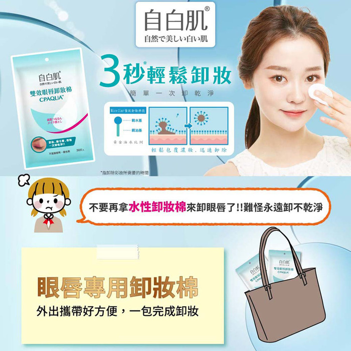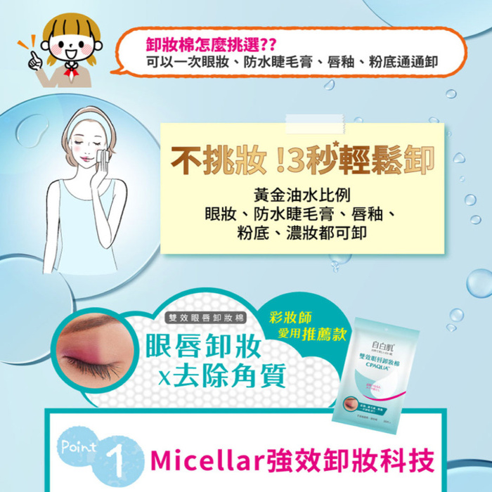 | 商品名稱/包裝內容規格 | 【自白肌】玻尿酸雙效眼唇卸妝棉(12片/包) |