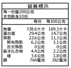 | 過敏原資訊 | 本產品含魚、大豆、麩質之穀物、芝麻類及其製品,不適合其過敏體質者食用。本產品 生產製程廠房,其設備或生產管線有處理蛋、花生、堅果、牛奶、螺貝、芒果、甲殼類,食物 過敏者請留意。 |