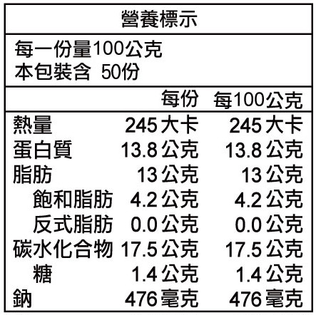 | 過敏原資訊 | 本產品含有大豆、麩質之穀物、小麥及其製品.本產品生產製程廠房,其設備或生產線有處理蝦,蟹,芒果,花生,牛奶,蛋及其製品等過敏原 |