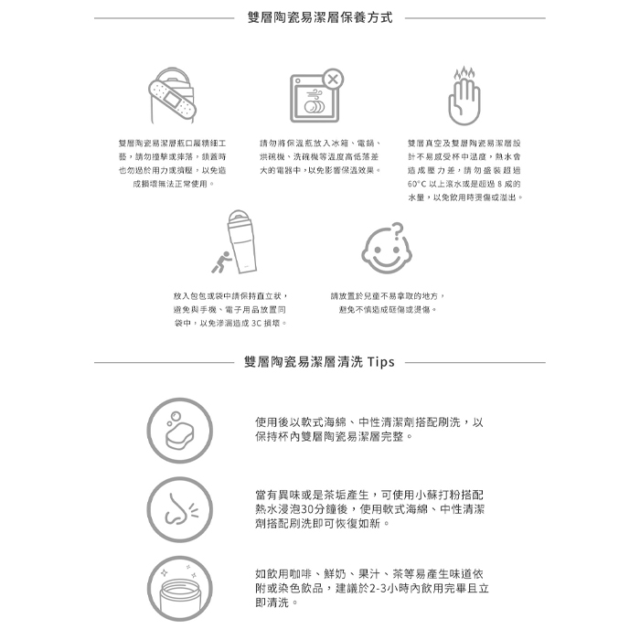瓶身內膽:304不銹鋼、雙層陶瓷塗層