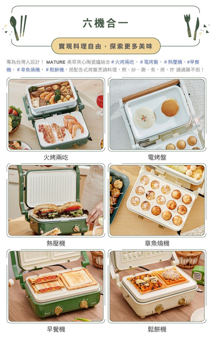 ✦ 六機合一 雙旋鈕溫控 可替換烤盤
