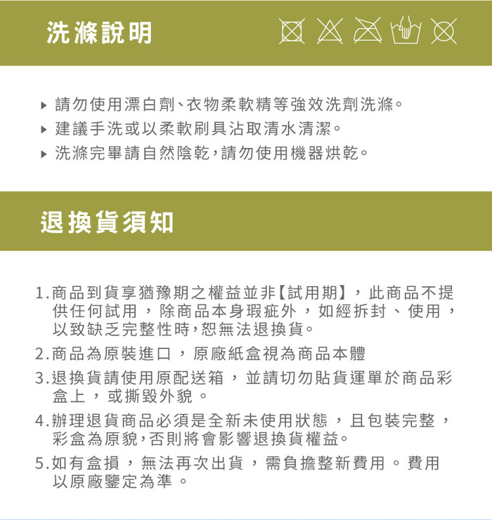 請勿機洗,建議手洗或以柔軟刷具沾取清水清潔。 請勿使用漂白劑、衣物柔軟精等強效洗劑洗滌。 洗滌完畢請自然陰乾,請勿使用機器烘乾。 本產品不提供試用,7天「鑑賞期」非「試用期」。除非是新品瑕疵問題,拆封後無法辦理退貨。欲辦理退貨之商品必須是全新完整、未拆封之包裝狀態(含商品本體、贈品、原包裝袋、盒、箱、隨貨文件)。 |