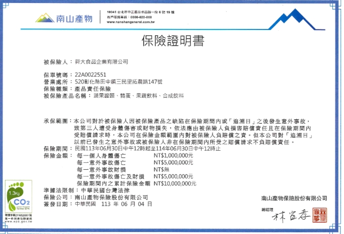 | 產品責任險 | 南山產物 22A0022551 1千萬 |