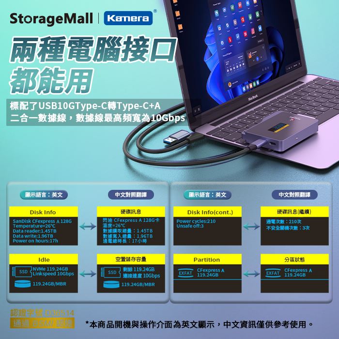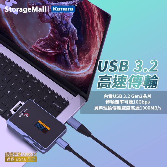 - 支援 USB 3.2 Gen 2(10Gbps)最高傳輸速度:搭載 USB 3.2 Gen 2 規格,可達最高 10Gbps(理論值)的傳輸速率,無論是專業攝影後製、高畫質剪輯,皆可快速匯入素材,大幅提升工作效率。