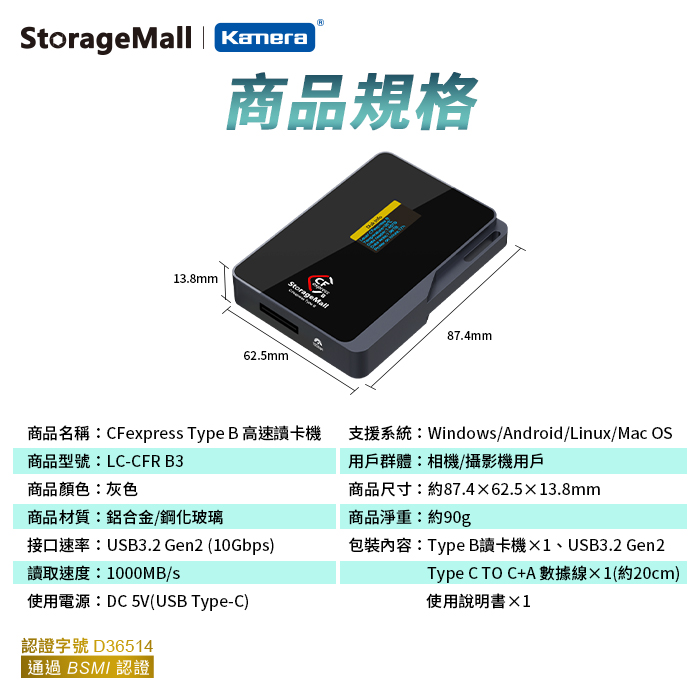 - 多設備系統廣泛相容:支援 Windows、Android、macOS、Linux 等主流作業系統,相容性高,不需額外驅動程式,插上即能使用。無論是在辦公室、影像編輯工作室,還是戶外移動剪輯環境,皆可快速讀取 CFexpress Type B 記憶卡資料。