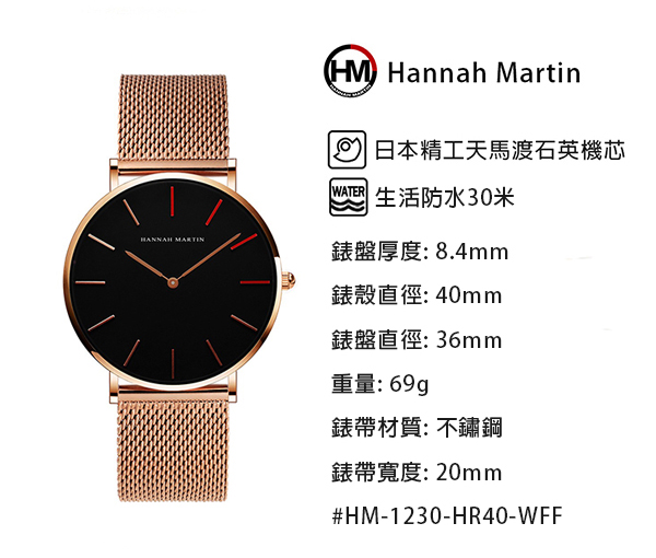 | 【商品名稱】 | 【HANNAH MARTIN】北歐極簡無秒針設計腕錶 型號:HM-1230-HR40-WFF |