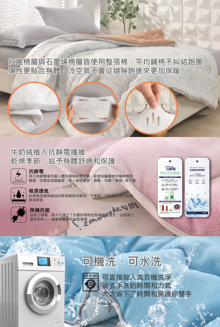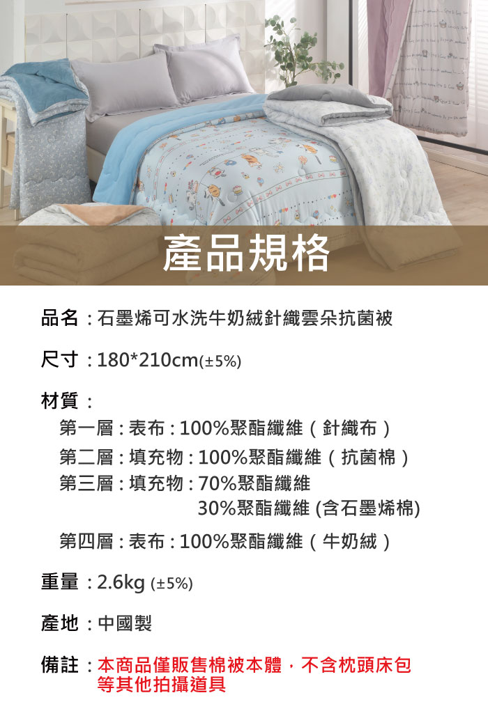 | 成分 | 第一層:表布:100%聚酯纖維(針織布) 第二層:填充物:100%聚酯纖維 (含抗菌棉) 第三層:填充物:70%聚酯纖維 / 30%聚酯纖維(含石墨烯棉) 第四層:表布:100%聚酯纖維(牛奶絨) |