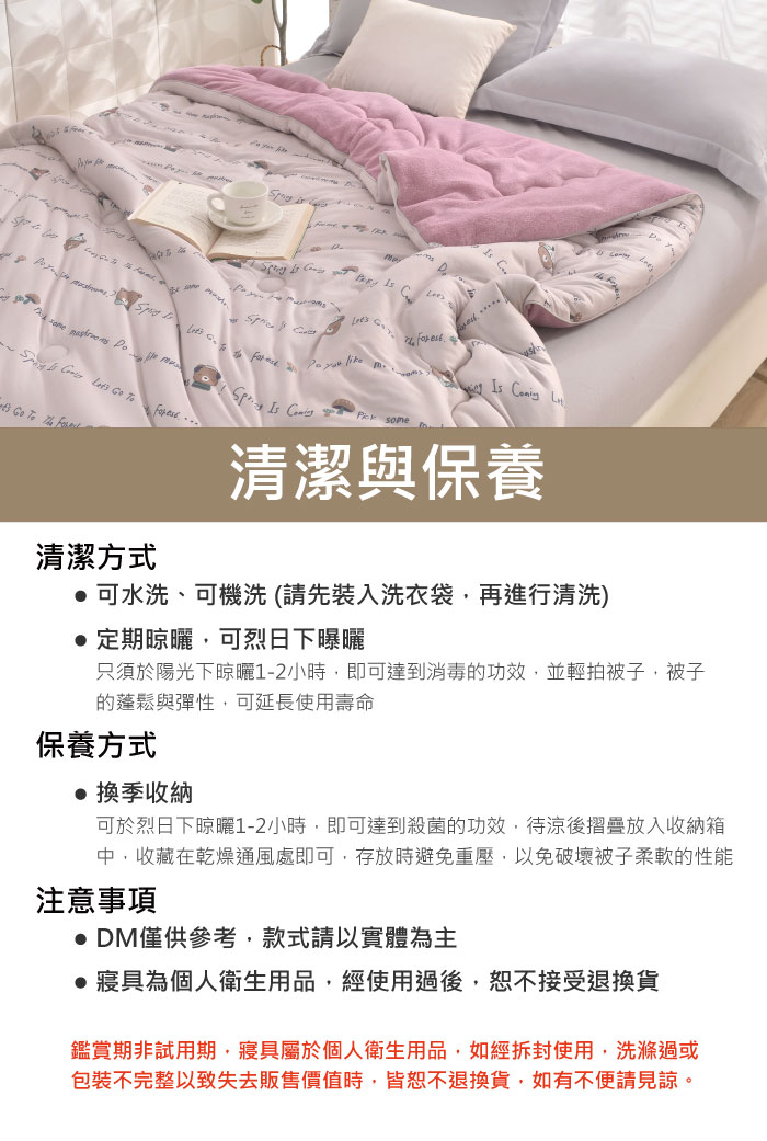 ◆使用方式:可直接使用或天冷搭配被套使用 ◆可水洗或機洗(請使用洗衣袋並單次單件洗滌) ◆請勿乾洗/漂白/烘乾/熨燙 |