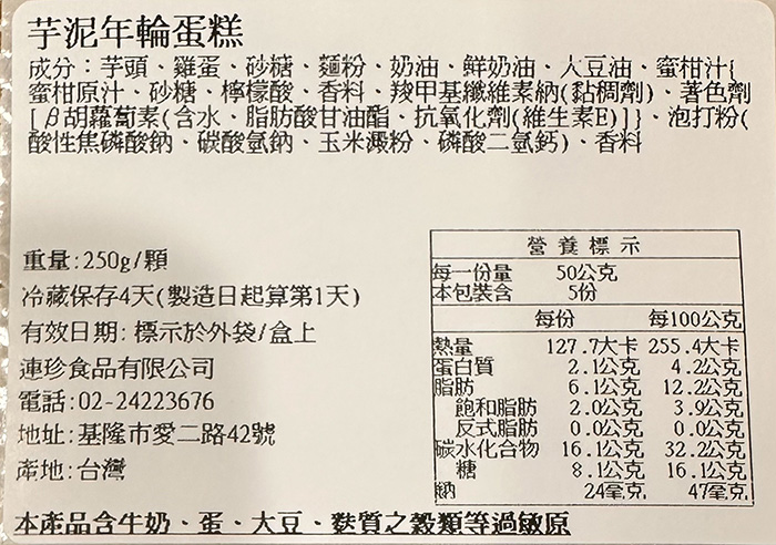 | 商品名稱 | 【基隆連珍】芋泥年輪蛋糕2盒(250g/盒) |