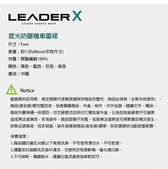 | 【商品名稱】 | 【Leader X】遮光防曬圍裙 - 4色可選 |