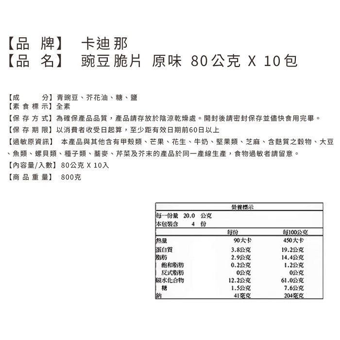 | 品名 | 卡廸那 豌豆脆片 原味 80公克 X 10包 |